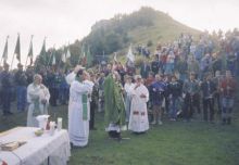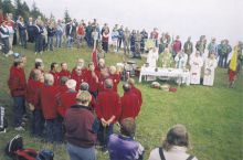 La S. Messa è stata celebrata dall’Arciprete in carica di Clusone Mons. Alessandro Recanati e concelebrata dal futuro arciprete di Clusone Don Giacomo Panfilo oltre che dal prevosto di Gandino Don Emilio Zanoli, da Padre Lenterio Bertasa, missionario, e da Padre Arturo Spelgatti della Casa dell’Orfano. Ha accompagnato la celebrazione il Coro Idica di Clusone. Le letture sono state curate dall’Associazione "Aiutiamoli a vivere". All’offertorio gli Alpini portavano all’altare pane, vino, cappello alpino, picozza, corda, fiori. Al termine della S. Messa il tradizionale scambio di doni e alle autorità veniva offerta una formella in cotto a ricordo del 12° Incontro, mentre 10 riproduzioni in ceramica della struttura della campana venivano regalate alle due Comunità Montane, ai due Comuni, alle due Parrocchie, ai due Gruppi Alpini e del Cai. E poi via con le fumanti polente, brasato, costolette, cotechini, formaggi e vino.