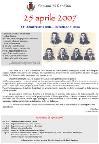 L'Amministrazione Comunale di Gandino ha scelto la storia eroica dei sette fratelli Cervi per ricordare la ricorrenza del 25 aprile 2007, 62°anniversario della Liberazione.