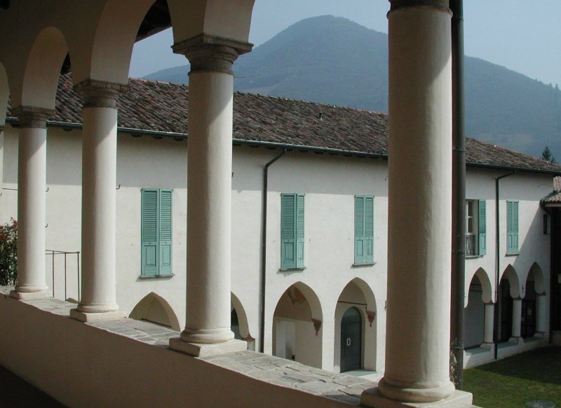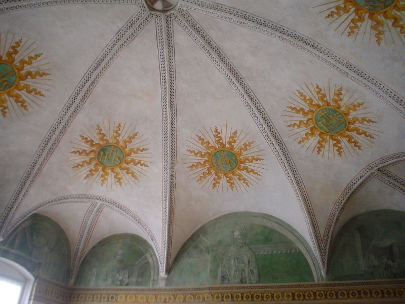 Dopo la soppressione decretata dalla Repubblica Cisalpina, le nuove esigenze imposero trasformazioni dell’organismo architettonico e, lentamente, alcune parti di esso vennero abbandonate; è il caso della chiesa di Santa Maria delle Grazie e di San Bernardino spogliata delle sue opere migliori (La Deposizione eseguita da Gian Battista Moroni nel 1566, ora alla Pinacoteca Carrara di Bergamo, e L’ Assunzione della Vergine con Santi di Enea Salmeggia, opera che si trova nella chiesa di S. Alessandro della Croce a Bergamo). Prima della demolizione di questo edificio sacro, avvenuta nel 1963, si provvide allo stacco di alcuni affreschi custoditi ora nel museo della Basilica di Gandino. Dalla demolizione furono salvati: il chiostro, decorato con una interessante meridiana e con affreschi cinquecenteschi e secenteschi recentemente restaurati, il corpo edilizio a due piani che delimita ad Est il chiostro e la splendida sala capitolare posta al piano primo, addossata all’antico presbiterio. La sala, che si apre su un ampio loggiato finito con arcatelle a tutto sesto, propone una pianta quadrata ed una volta ad ombrello. Ciò che la rende unica è la decorazione a tempera delle lunette. Sono ritratte in monocromo verde figure a mezzo busto di santi e personaggi francescani, opera del 1501 attribuita alla bottega del Marinoni. La decorazione della volta è essenziale e propone una semplice greca a segnare le costolature dell’ombrello; in ogni spicchio è proposto il monogramma dell’Euca-ristia, attributo di Bernardino da Siena, nei colori verde e giallo ocra.