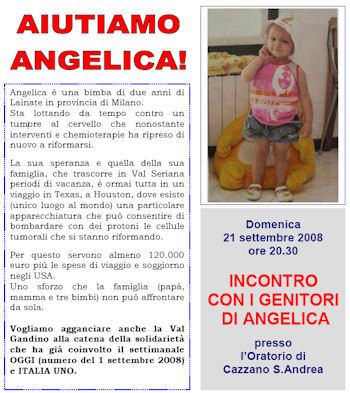 Vogliamo agganciare anche la Val Gandino alla catena della solidarietà che ha già coinvolto il settimanale OGGI (numero del 1 settembre 2008) e ITALIA UNO.