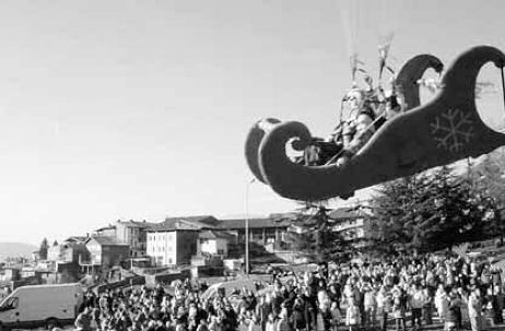 L'atterraggio è stato affidato al coordinamento della Pro loco e alla perizia dei componenti della «Scuola di volo libero monte Farno», che con l'ausilio del parapendio hanno fatto planare una decina fra «damigelle» dotate di scopa e Babbi Natale in completo rosso. Un'ovazione è stata riservata alla grande slitta che ha chiuso gli atterraggi, condotta da Diego Servalli, direttore della scuola monte Farno.