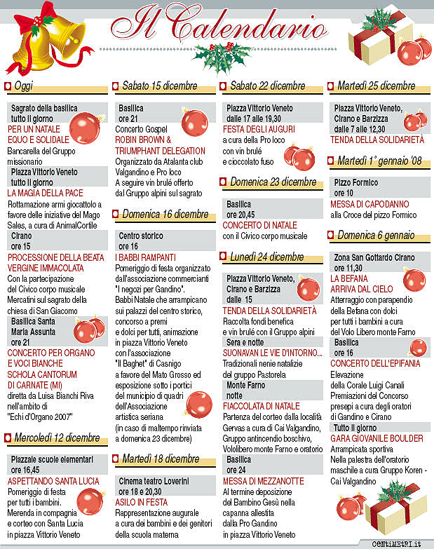 «L'evento chiude la rassegna "Echi d'organo", che sta riscuotendo un ottimo successo, ed è l'occasione ideale per introdurre il clima natalizio. La formazione è composta da una trentina di bambini, guidati da Luisa Binachi Riva. Il 15 dicembre sarà invece la volta del concerto gospel, per il quale è decisivo l'impegno dell'Atalanta club Valgandino. Ad esibirsi sarà la cantante di colore Robin Brown, una vera e propria star, che ha cantato con Michael Jackson, nel 1986 in occasione del centenario della Coca Cola e ad Atlanta per le Olimpiadi del 1996».