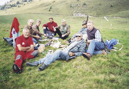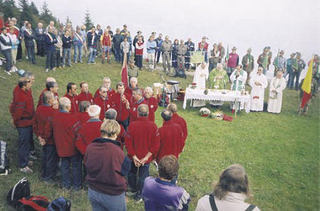 La S. Messa è stata celebrata dall’Arciprete in carica di Clusone Mons. Alessandro Recanati e concelebrata dal futuro arciprete di Clusone Don Giacomo Panfilo oltre che dal prevosto di Gandino Don Emilio Zanoli, da Padre Lenterio Bertasa, missionario, e da Padre Arturo Spelgatti della Casa dell’Orfano. Ha accompagnato la celebrazione il Coro Idica di Clusone. Le letture sono state curate dall’Associazione "Aiutiamoli a vivere". All’offertorio gli Alpini portavano all’altare pane, vino, cappello alpino, picozza, corda, fiori. Al termine della S. Messa il tradizionale scambio di doni e alle autorità veniva offerta una formella in cotto a ricordo del 12° Incontro, mentre 10 riproduzioni in ceramica della struttura della campana venivano regalate alle due Comunità Montane, ai due Comuni, alle due Parrocchie, ai due Gruppi Alpini e del Cai. E poi via con le fumanti polente, brasato, costolette, cotechini, formaggi e vino.