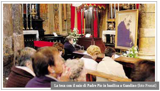 Erano circa trecento i fedeli che ieri hanno gremito la basilica di Santa Maria Assunta a Gandino per la prima pubblica ostensione del saio di Padre Pio da Pietrelcina, donato alla parrocchia da una famiglia del paese, che lo ebbe in dono dai frati cappuccini in occasione del Natale 1941. La Messa inaugurale è stata celebrata dal prevosto monsignor Emilio Zanoli e da padre Dino Bonazzi, missionario comboniano in Ecuador e originario di Gandino. Nell'omelia, monsignor Zanoli ha ricordato i tratti salienti della figura del santo di Pietrelcina, citando in particolare quanto affermato da Giovanni Paolo II nel giugno 2002 in occasione della canonizzazione. «Insegna anche a noi – disse allora il Papa – l'umiltà del cuore, per essere annoverati tra i piccoli del Vangelo, ai quali il Padre ha promesso di rivelare i misteri del suo Regno. Ottienici uno sguardo di fede capace di riconoscere prontamente nei poveri e nei sofferenti il volto stesso di Gesù».