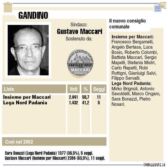 Gandino riconferma sindaco il bancario in pensione Gustavo Maccari: la lista «Insieme per Gandino, Barzizza e Cirano - Maccari sindaco» si porta a casa 2.041 voti contro i 1.432 della Lega Nord, candidato sindaco Mirko Brignoli. Maccari, 63 anni, fin dal primo pomeriggio ha festeggiato quella che da subito si è prospettata come una vittoria. Nel quartier generale di via Papa Giovanni, tappezzato di ritagli di giornale con i resoconti delle opere e delle manifestazioni degli ultimi cinque anni, dalla porta spalancata ieri erano in molti ad entrare, anche solo per una stretta di mano.