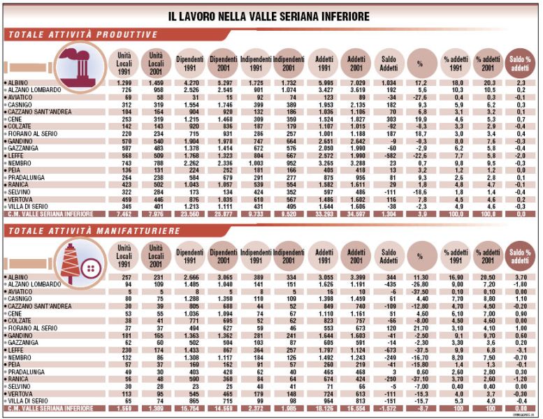 Per riassumere le tendenze generali possiamo dire, come sottolineano Ferdinando Piccinini, Vanni Stroppa, segretari della Cisl e Domenico Bigoni, responsabile dell'Ufficio tecnico sindacale, che, se nel decennio rilevato dal censimento la media Valseriana ha registrato un deciso calo degli addetti nel manifatturiero, dell'8,7% con punte del 37,5% a Leffe, questo calo è stato temperato da un incremento degli addetti nelle attività produttive in generale e nel terziario anche se si tratta di un terziario tutt'altro che avanzato: dagli idraulici alle badanti tanto per capirci. Negli anni successivi però la situazione è peggiorata: una vera gelata occupazionale. Lo si capisce paragonando l'area in questione con l'intera realtà orobica. Nel 2000 sono state avviate al lavoro in Bergamasca 92.000 persone, nel 2004 119.000. Nella media Valseriana nel 2000, 7.400 gli avviamenti scesi a 6.675 nel 2004. La provincia cresce, magari per lavori temporanei, comunque cresce, la Valseriana invece si contrae.