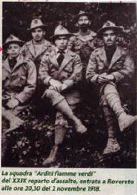 Gli “arditi” erano squadre composte da elementi specializzati in colpi di mano e a sorpresa nei riguardi di reparti nemici, quindi di soldati senza paura. Successivamente, con la sua squadra, partecipò a diverse azioni di guerra (anche all’arma bianca) fino al 2 novembre, allorquando (ne fa fede appunto la foto) fu il primo ad entrare in Rovereto. Da una testimonianza resa verbalmente da un nipote del nostro, risulta presente due giorni dopo (4 novembre), giorno dell’armistizio, nella città di Trento, festeggiato dagli abitanti di quella città liberata. Ma la vita grama del nostro non finì qui; anzi, cominciò da quel giorno una vera e propria odissea. Infatti con la sua squadra dal Trentino attraversò la Val di Sole fino al Passo del Tonale, entrato in Val Camonica raggiunse l’Aprica e da qui la Valtellina; con quale messo non è dato sapere (con ogni probabilità la sua squadra era composta da Camuni e Valtellinesi)
