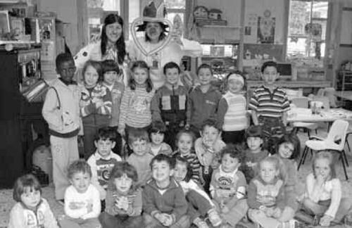 I bambini della materna di Gandino con due clown di corsia