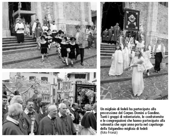 Malgrado il tempo incerto, Gandino ha concluso le Quarantore che precedono il Corpus Domini con la solenne processione per le vie del paese addobbate da festoni colorati. Circa un migliaio di fedeli sono intervenuti al rito che è seguito alla Messa celebrata da monsignor Ilario Girelli. La processione, una delle poche in provincia che ha mantenuto nel tempo la sua solennità e l'apparato fastoso che compete alle grandi feste religiose, è stata, ancora una volta, all'insegna della preghiera, ma anche della spettacolarità grazie all'impegno dei gruppi di volontariato, delle congregazioni, delle confraternite nei loro variopinti costumi, dei sacerdoti, della banda e della corale «Canali», oltre alla popolazione e ai numerosissimi fedeli che intervengono richiamati dalla eccezionalità dell'avvenimento. Il lungo e maestoso corteo ha preso le mosse dalla piazza antistante la basilica e si è snodato lungo le antiche vie del borgo antico percorrendo una sorta di galleria la cui volta era costituita da festoni di colore diverso a seconda delle contrade. Al centro del corteo, riparato dal baldacchino, il sacerdote con l'ostensorio in stile gotico, datato 1527, in argento cesellato, alto 127 centimetri, del peso di 11 chilogrammi. Il corteo ha sostato in piazza Vittorio Veneto, davanti al municipio, e presso la chiesa di San Mauro annessa alla casa madre delle Orsoline di Gandino dov'è stata impartita la benedizione.