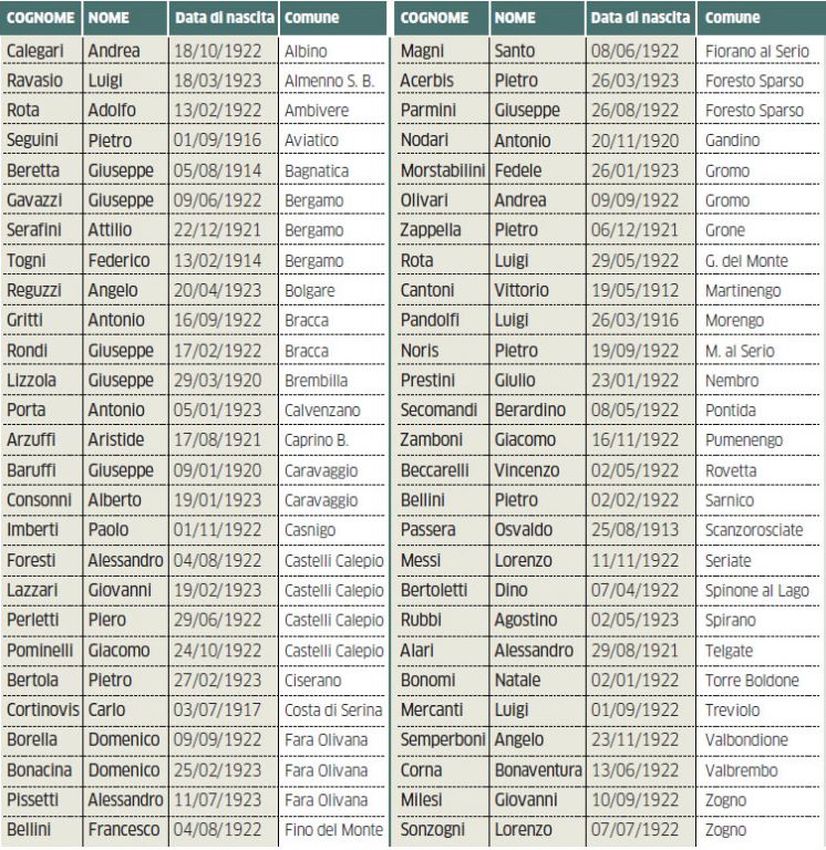 Grazie al tam tam lanciato dal nostro giornale, abbiamo raccontato in seguito le storie di Giuseppe Baruffi di Caravaggio, Giuseppe Beretta di Bagnatica, Pietro Bertola di Ciserano, Agostino Leonardo Rubbi di Spirano, Pietro Giovanni Zappella di Grone, Domenico Borella di Fara Olivana, Vincenzo Beccarelli detto Angelo di Rovetta, Giacomo Pominelli e Giovanni Lazzari di Castelli Calepio. All’elenco di Antonio Caprio vanno sicuramente aggiunti Alessandro Pizzetti e Giacomo Zamboni di Antegnate (i loro cognomi furono storpiati nella lista d’imbarco in Pizziretti e Zampone), ma anche Sperandio Visinoni e Angelo Marinoni di Rovetta.