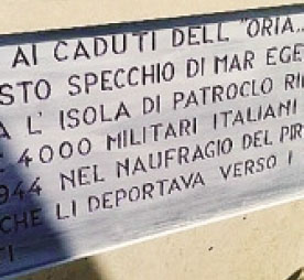 Il Piroscafo Oria, affondò il 12 febbraio 1944 a sole 25 miglia a sud di Atene, provenendo da Rodi. Trasportava 4200 Internati Militari Italiani appartenenti a tutte le Armi, condotti verso la prigionia, dopo aver rifiutato di collaborare coi nazifascisti. Meno di 30 si salvarono. Pochi ebbero una sepoltura, comunque anonima.