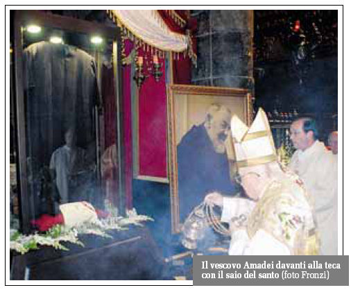 Nell'omelia il vescovo ha sottolineato «il legame forte di Padre Pio con il Cristo Crocifisso, sostenuto da una fede esemplare che è sempre andata al di là del tempo e delle situazioni, che ha tenuto l'amore per Dio quale punto fermo e irrinunciabile del cammino». Il vescovo Amadei ha sottolineato che «la fede è amore gratuito, perché senza gratuità non c'è amore. Una prospettiva che deve guidare ogni iniziativa nelle nostre parrocchie, una luce attorno alla quale far crescere le attività pastorali».