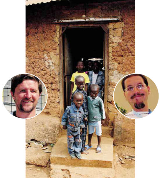 Bambini in un villaggio della Costa d’Avorio. A sinistra, don Andrea Mazzoleni; a destra, don Massimo Cornelli