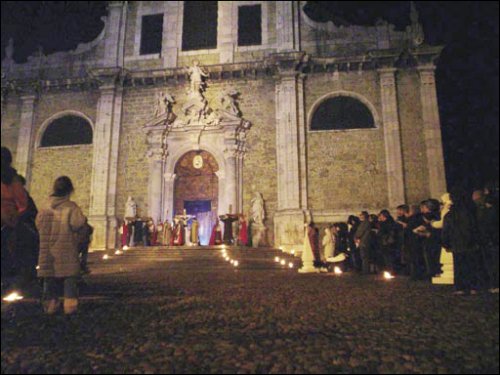Davanti alla Basilica è stata rappresentata la Crocifissione, con un aspetto scenografico coinvolgente arricchito da numerose fiaccole. Il Simulacro del Cristo Morto, esposto in Basilica il Venerdì Santo, è stato accompagnato in processione sino alla Chiesa di Santa Croce, dove un’ultima stazione e la preghiera hanno concluso una serata intensa e molto partecipata.