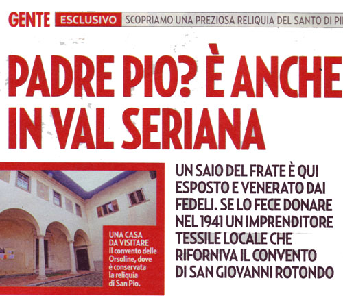 Il settimanale GENTE  (nr.9 – 8 marzo 2016) propone un servizio esclusivo legato alla Valle Seriana e alla venerata figura di San Padre Pio da Pietrelcina.