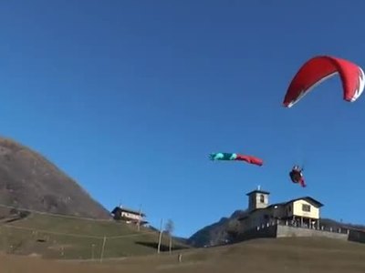 A Cirano in parapendio per portare caramelle ai bambini. L'iniziativa, che si ripete da vent'anni, in ricordo di Diego Servalli.